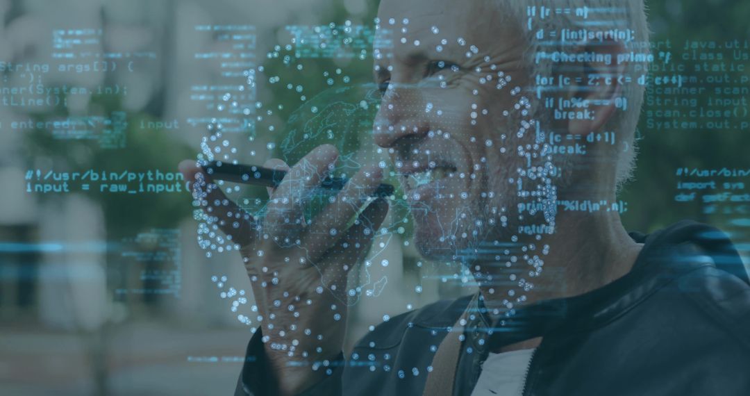 Middle-aged man sits outdoors holding a smartphone to his mouth, using voice commands, while a transparent overlay of computer code is visible in the foreground. This scene symbolizes the intersection of human technology and programming as professionals embrace innovative ways to communicate with devices and enhance productivity. Ideal for use in articles or marketing about tech advancement, sophisticated digital communication, or programming languages.