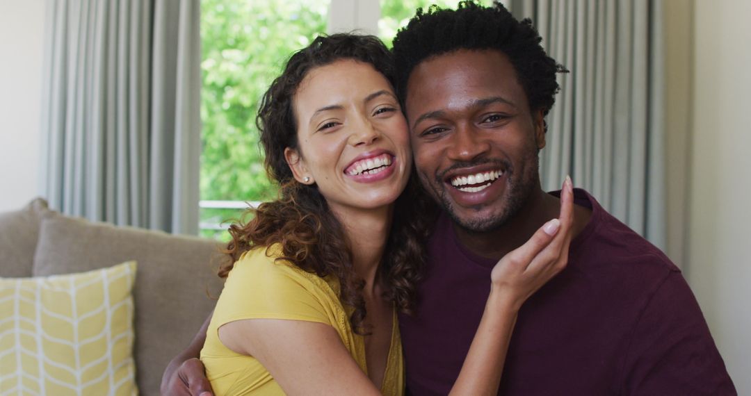 This scene captures a joyful biracial couple affectionately embracing and smiling at home, creating a warm and intimate portrayal of love and friendship. Their relaxed posture and bright expressions evoke happiness and connection, perfect for use in campaigns celebrating relationship, home, or leisure activities. It can also complement marketing for consumer products aimed at families or couples, inspiring lifestyle blogs about love and companionship.