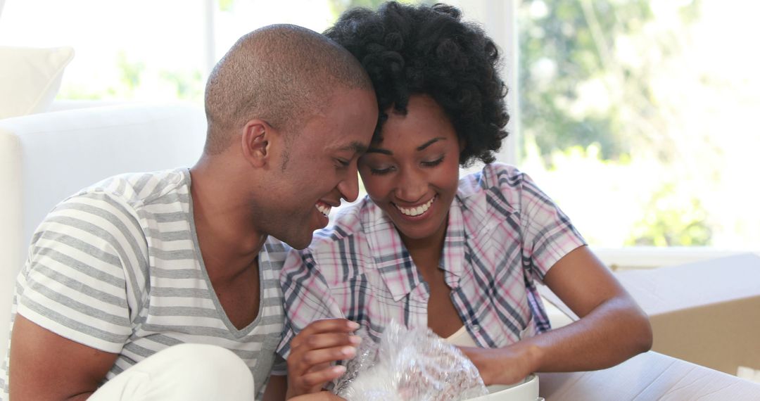 A young couple is experiencing the joy of unpacking a box, with wide smiles indicating delight and shared happiness. Ideal for content focusing on relationships, home life, and new beginnings, an atmosphere of warmth and intimacy is depicted. Perfect for editorial pieces about moving in together or celebrating special moments at home.