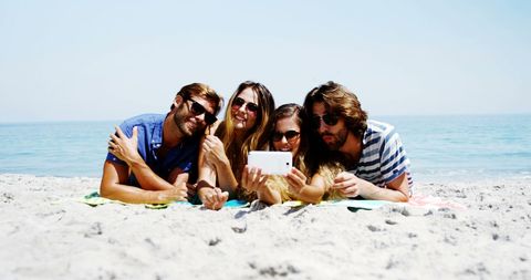 - Joyful Friends Capturing Fun Moments on Beach Rocks During Sunny Day