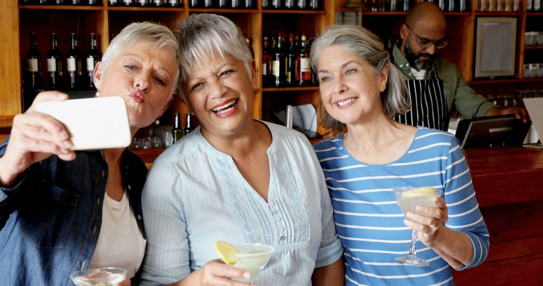 Three middle-aged women capturing a joyful moment together at a bar, enjoying beverages and camaraderie. Their expressions highlight a friendly and casual gathering, ideal for presentations on friendship, social activities, lifestyle content, or promotions for bars and social events.