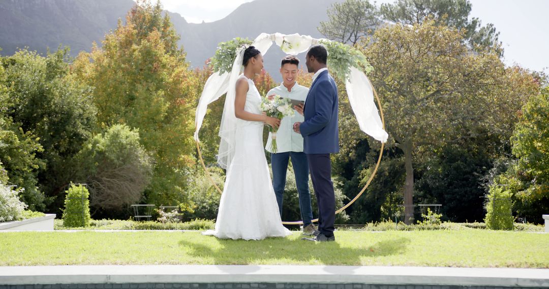This depicts a joyful wedding ceremony in a beautiful outdoor garden setting. A diverse bride and groom are standing with an officiant using a tablet, suggesting a mix of tradition and technology. The sunny environment with lush greenery enhances the cheerful and romantic atmosphere. Use this for articles or promotional materials about weddings, diversity, love, or unique ceremony ideas.