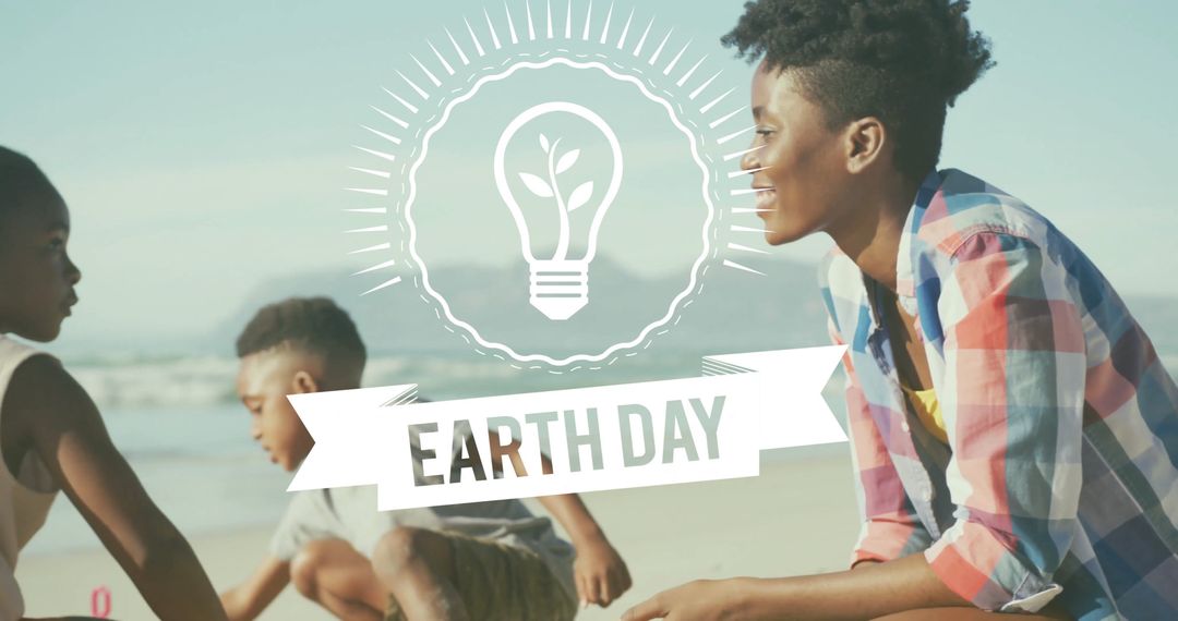 Features cheerful children interacting by the seaside under an appealing light bulb and leaf icon, signifying Earth Day. Ideal for use in campaigns supporting environmental awareness, educational presentations related to conservation, or promotional material for Earth-friendly events.