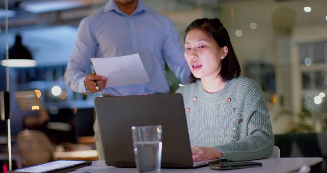 - Late Night Office Work Collaboration with Laptop Discussion