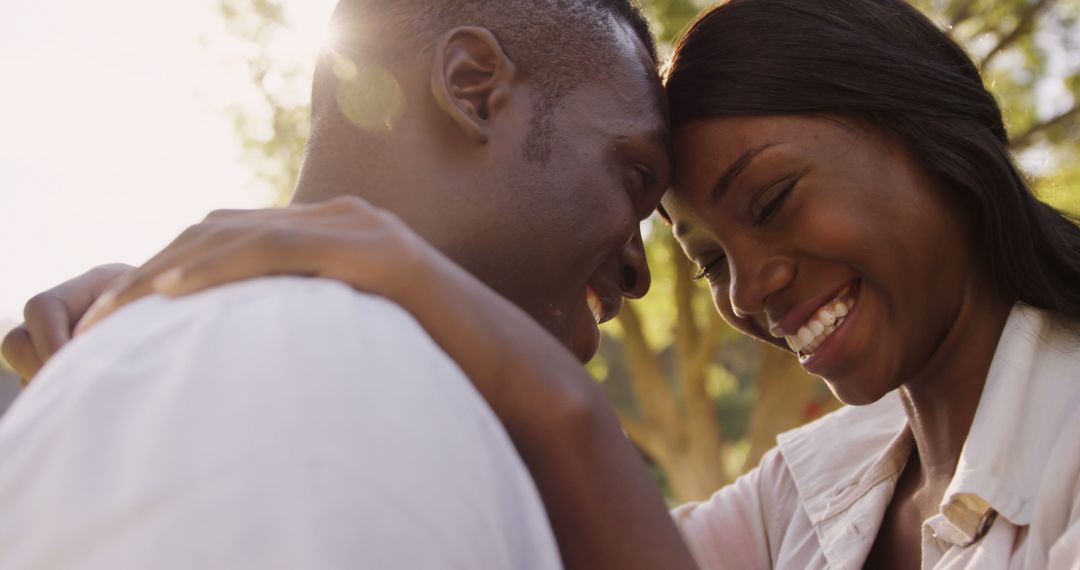 A joyful African American couple is sharing a tender embrace while enjoying a sunny day. Their expressions convey a strong sense of love and intimacy. This image is perfect for romantic themes, relationship advice articles, or positive messaging in advertisements.