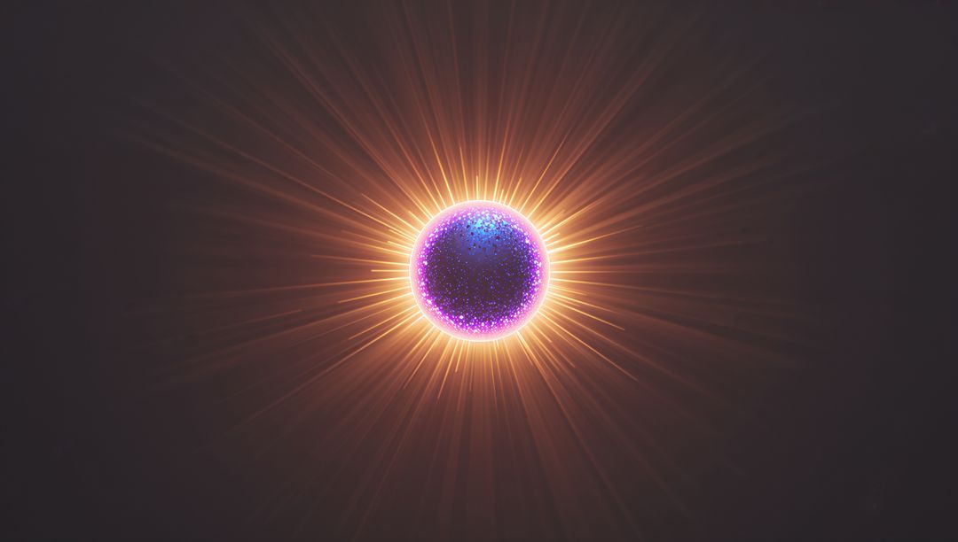 Luminous Neon Orb Radiating Purple Core with Orange Halo and Radial Light Beams Image