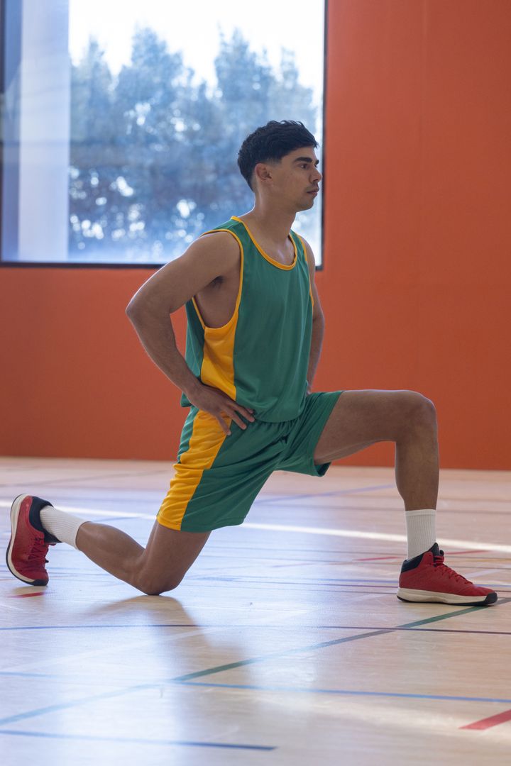 Young male athlete stretches in green and yellow sports uniform, performing a lunge on a marked basketball court adjacent to a large window. Dressed in red sneakers and socks, he showcases fitness dedication. Versatile for signage promoting gym facilities, athletic programs, fitness apps. Suggests focus on mobility and recovery exercises in athletic training.