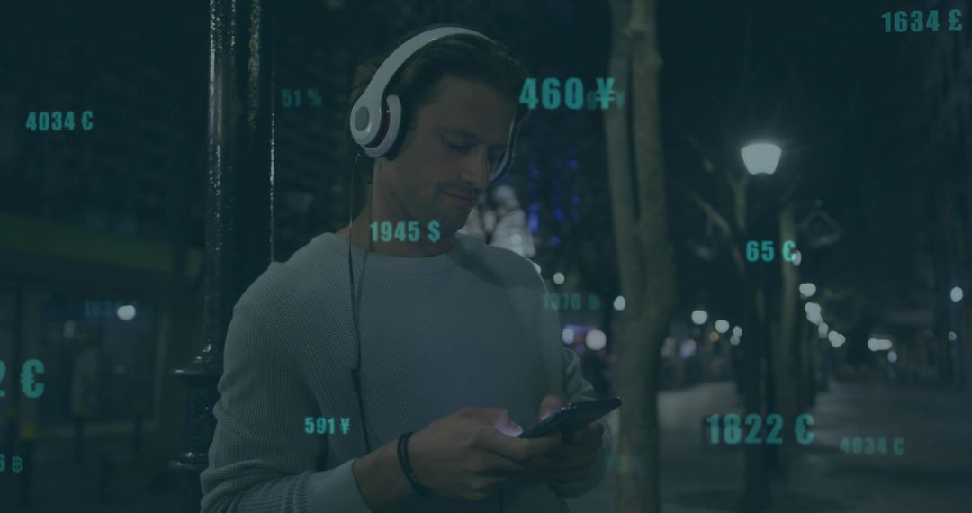 This captures a man leaning against a lamppost in a city street, wearing headphones, engaging with his smartphone. Background features a night setting with virtual currency symbols floating, adding a digital and futuristic element. Ideal for themes involving modern technology, financial apps, digital finance, and urban lifestyle concepts.
