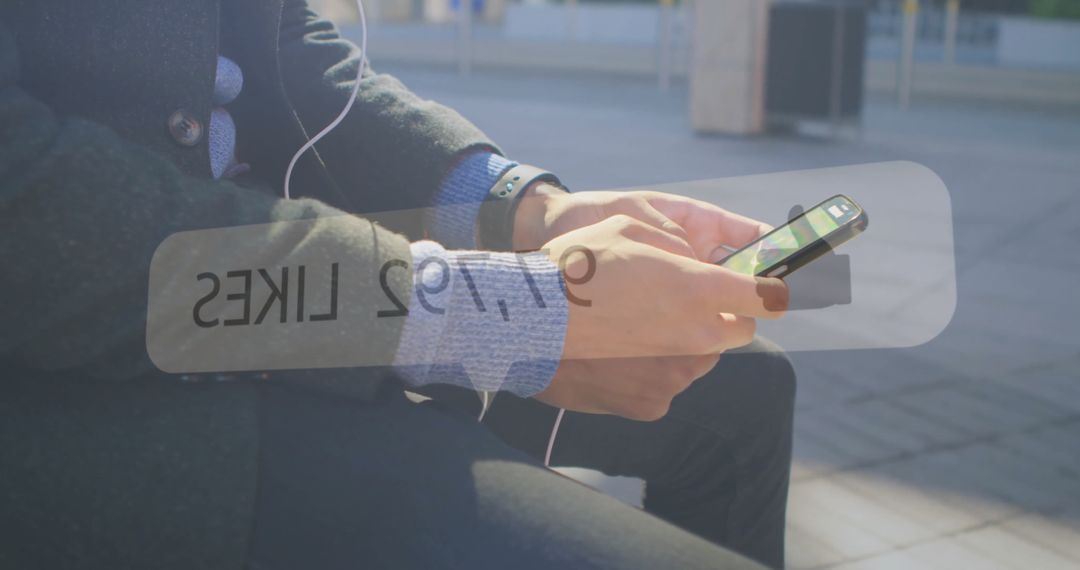 Individual checking smartphone while sitting outdoors with likes overlay symbolizing social media engagement. Useful for topics related to digital connectivity, online influence, content creation, and internet trends. Ideal for blogs, articles, or advertisements focused on the impact of social media and technology on modern communication.