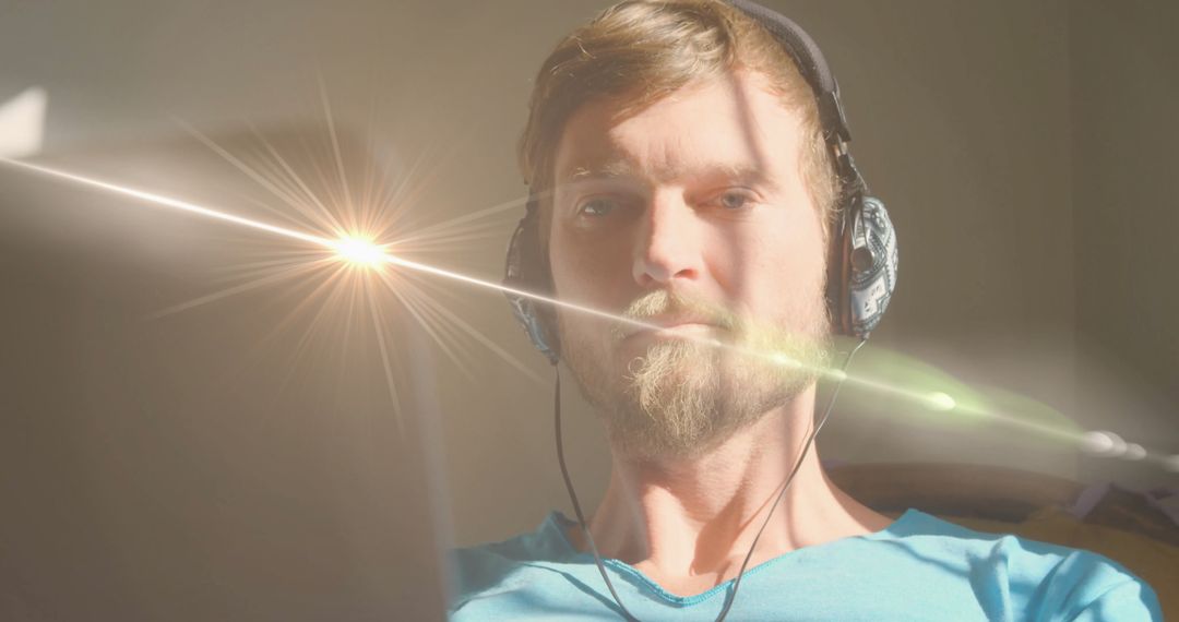 Man in Headphones Working Intensely on Laptop in Sunlit Room Image