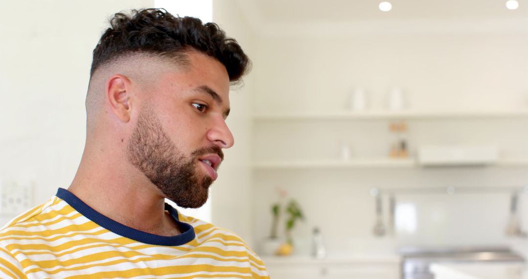 Man in a contemporary kitchen stands attentively observing off-camera. Glancing towards a water bottle and lemon on the counter, suggesting a pause or contemplation. Features minimalist design accentuated by simple decor like a small plant. Versatile use in lifestyle blogs, interior design articles, or contexts where modern home environments are discussed.