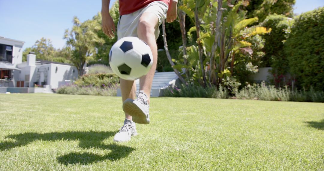 Scene captures feet of young athlete expertly juggling soccer ball in lush garden under bright sun. Image perfect for sports-focused content, training guides, or advertisements promoting outdoor fitness and leisure activities.