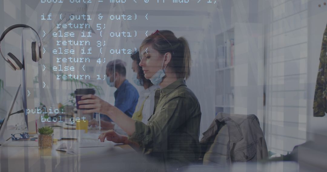 This visual showcases office professionals wearing face masks while working with financial data, reflecting a COVID-19 era workplace. Ideal for illustrating themes of finance, digital transformation, pandemic response in businesses, and the transition to more technology-driven environments. Useful for company reports, presentations or articles focusing on the impact of COVID-19 on the professional and financial sectors.