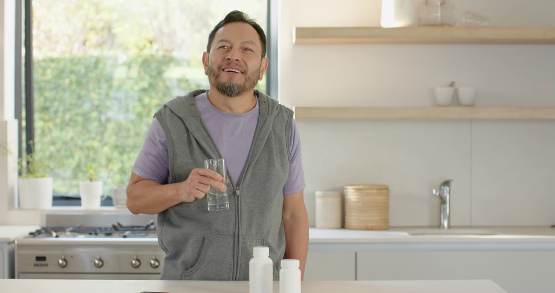 - Mature Asian Man Drinking Water with Supplement in Natural Light Kitchen