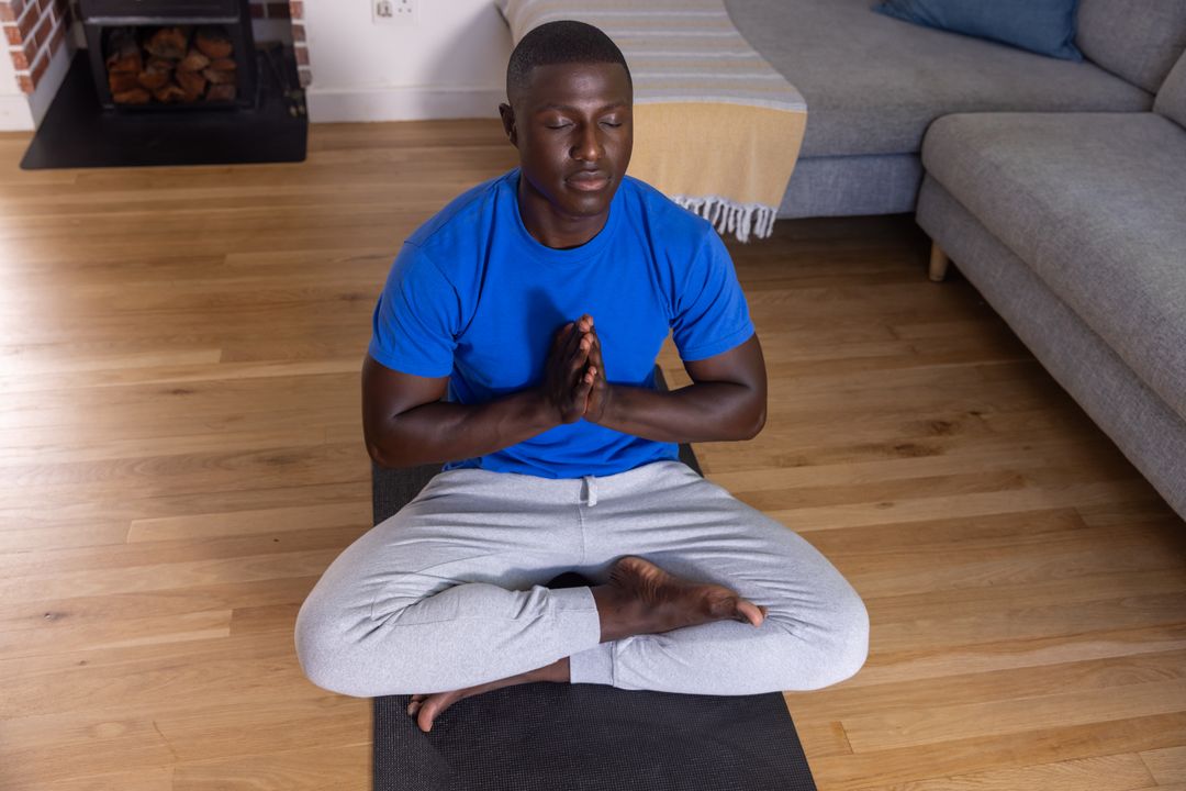 This image shows an African American man practicing meditation on a yoga mat indoors. Suitable for illustrating themes of wellness, relaxation, and mindfulness in digital media or print publications promoting a healthy lifestyle and mental well-being.