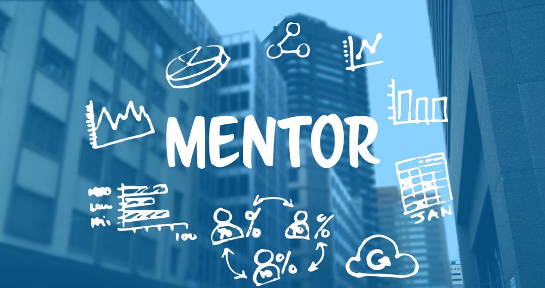 Illustration with "Mentor" and business concept icons like graphs, teamwork, and analytics over city skyscrapers suggests professional guidance and business strategies. Ideal for promotions, corporate training materials, coaching sessions, or educational purposes related to mentorship or business development.