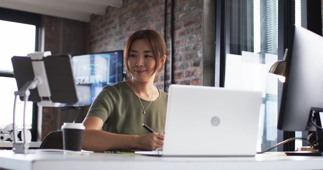 Middle-aged Asian woman is seated at a modern office desk with a brick wall backdrop, using a laptop and a tablet stand. Her attire is casual and she is smiling, exuding a sense of contentment and dedication. This image could be useful for showcasing modern work environments, remote or digital work setups, business articles about productivity, or marketing materials focused on professional and determined individuals.
