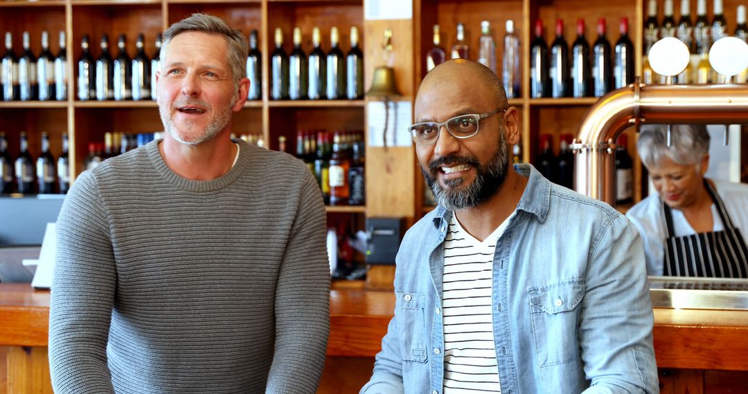 - Middle-Aged Men at Wine Bar Exuding Relaxed and Friendly Atmosphere