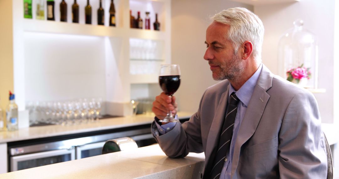 - Middle-aged Professional Enjoying Red Wine at Modern Bar