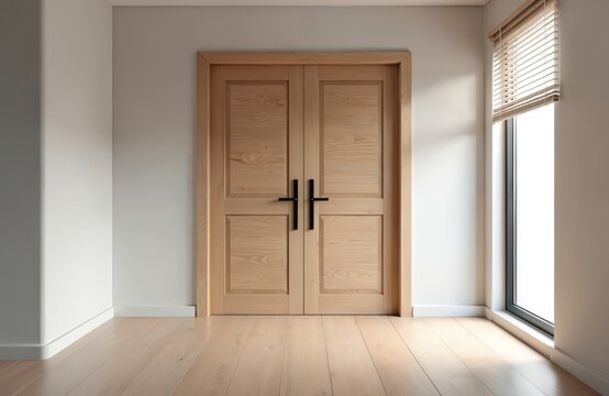 - Minimalist Empty Room with White Double Doors and Wooden Floor