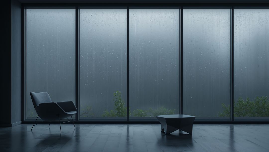 AI Generated Image. Serene minimalist interior showing rain-streaked floor-to-ceiling glass, padded lounge chair, geometric low table, and soft reflections on hardwood floor. Moody blue-gray palette conveying calm, contemplation, and quiet luxury. Suiting interior design portfolios, architecture editorials, lifestyle blogs, website hero banners, social media posts, and product mockups. Working well as background for quote graphics, wellness branding, real estate listings, moodboards, and storefront banners. High negative space providing room for text overlay and strong typography. Lighting and mood fitting editorial layouts, atmospheric advertising, and digital storytelling.