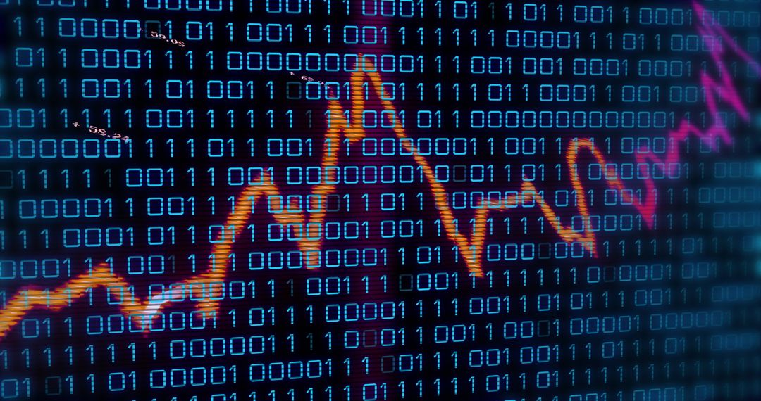 Orange zigzag chart over binary digits suggests a blend of data and analytics in technology and finance. Useful for projects related to data science, information technology, digital finance, or presentations on software development. This depiction can be used in brochures, websites, or presentations that discuss trends in data analytics and industry disruptions.