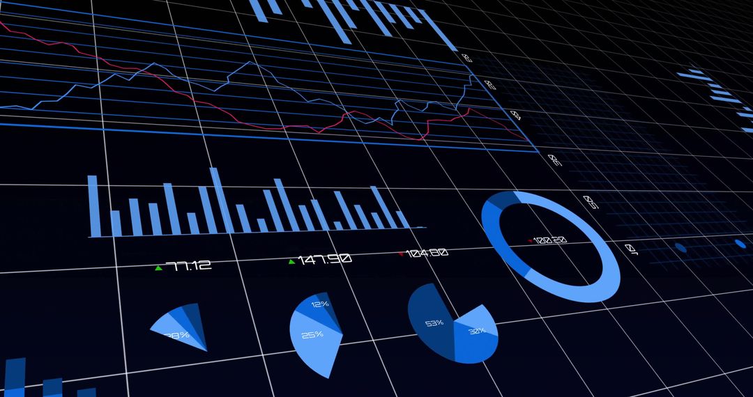 Modern and sleek digital dashboard showcasing various forms of data visualization including line charts, pie charts, and donut charts on a virtual grid background. Designed for use in presentations, reports, and infographics, this detailed representation can be especially useful for showing financial or technological data analytics. The blue-toned graphics provide a distinctive high-tech look ideal for corporate and educational purposes.