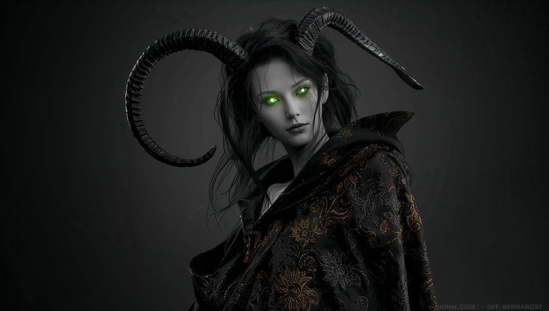 AI Generated Image. Depiction of a mythical creature adorned in an elegantly embroidered cloak, featuring an ethereal gaze and prominent horns. Busting with an enigmatic presence, this fantasy-inspired concept can be utilized for projects on mythical worlds, fantasy role-playing games, or illustrating gothic narratives.