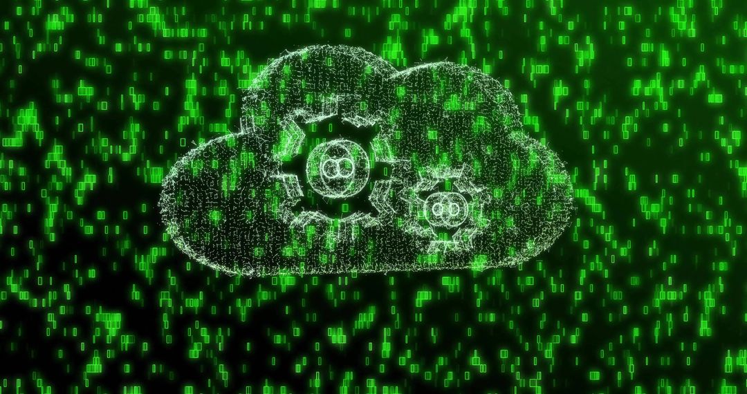 - Neon Cloud Computing Concept with Gears and Falling Binary Code Powering Digital Systems