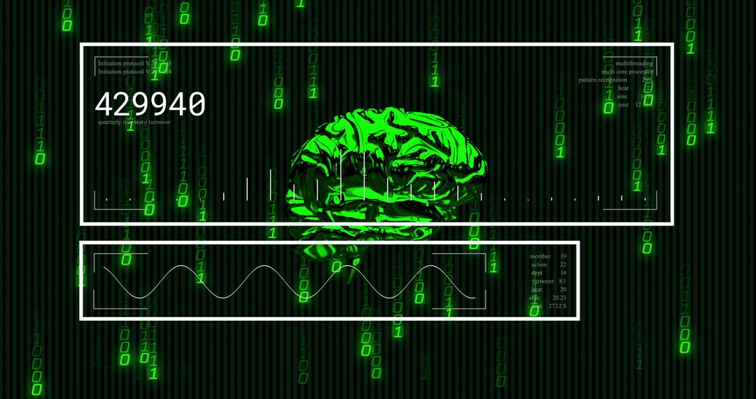 Displaying neon-green brain inside HUD panels, showing numeric readout 429940 and cascading green binary digits. Combining cybernetic aesthetics with clean data visualization elements, offering bold central focal point for technology and innovation themes. Providing high-contrast neon palette and minimalist white data frames for clear overlays and text placement. Suited for website hero banners, blog headers, slide deck covers, conference posters, whitepapers, product landing pages, app UI backgrounds, advertising creatives, social media campaigns, and motion graphics. Working well for topics such as AI research, machine learning, cybersecurity, neural interfaces, data analytics, quantum computing, and digital transformation. Editing suggestions: consider changing numeric readout, adjusting color tint, adding brand logo within HUD frames, animating cascading digits for video or interactive content.