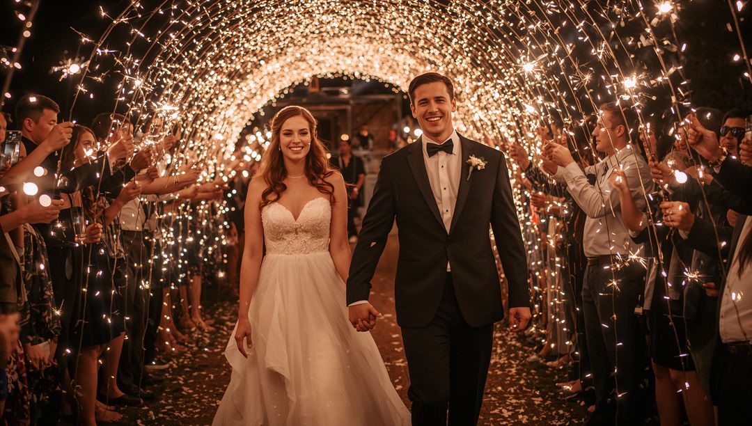 AI Generated Image. Scene showing newlyweds walking hand in hand through tunnel of sparklers and warm fairy lights at night, bride wearing lace bodice ball gown, groom wearing classic black tuxedo with bow tie. Guests lining both sides holding sparklers, creating glittering archway and festive pathway. Lighting producing warm golden glow, confetti scattering along ground, faces showing joy and celebration. Composition featuring centered couple, shallow depth of field and cinematic bokeh, offering ample space for text overlay and multiple crop options. Usage ideas include serving as hero visual for wedding venue websites promoting evening receptions and sparkler exits; illustrating wedding planning blogs and editorial pieces on reception trends; enhancing social media announcements, save-the-date posts, invitation and thank-you card designs; supporting advertising for wedding vendors such as planners, photographers, lighting designers, bridal boutiques and tuxedo rental; and decorating magazine spreads, brochures, banners and event signage.