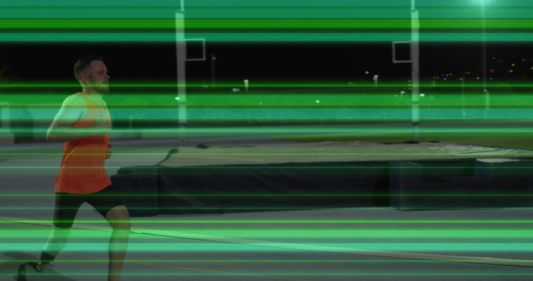 - Night runner sprinting with neon green light streaks on outdoor track, copy space