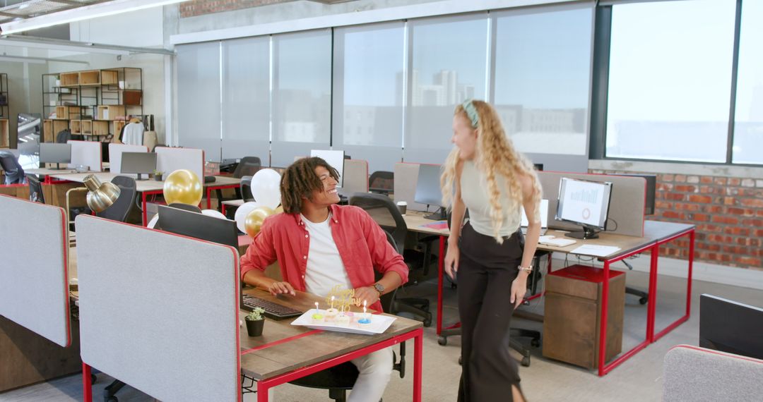 Two colleagues celebrating a birthday in a modern office environment. A man sits at a workspace with a small birthday cake, balloons decorated around, while a woman engages with him cheerfully. Ideal for depicting positive work culture, employee engagement, corporate celebrations, or productivity and work-life balance themes. Can be used in business promotions, HR recruitment, or office event content.
