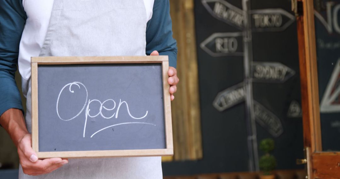 - Open Sign Chalkboard Held by Shopkeeper in Apron
