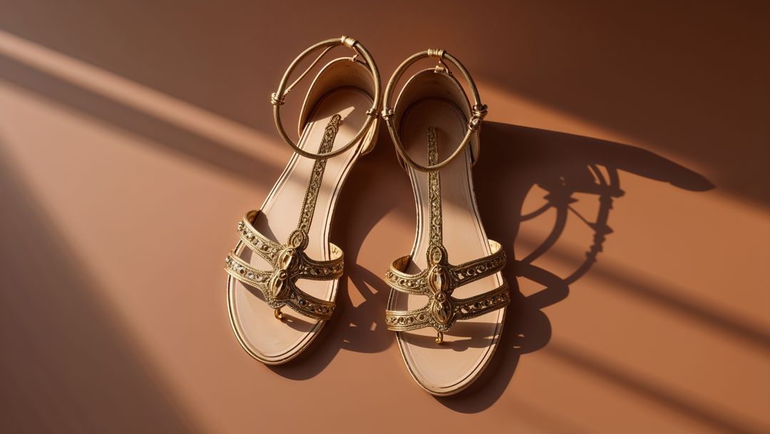 - Ornate Gold-Tone Women's Sandals on Sunlit Surface