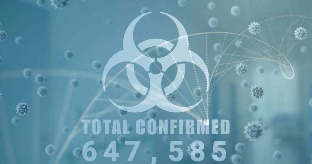 Composite showcasing total confirmed COVID-19 cases with biohazard and symbols of viral activity encapsulates global pandemic and healthcare response themes. Suitable for educational materials highlighting pandemic data, healthcare reports, and anthologies on biological dangers.