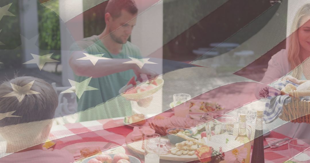 - Peaceful Family Picnic with American Flag Overlay Symbolizing Patriotism