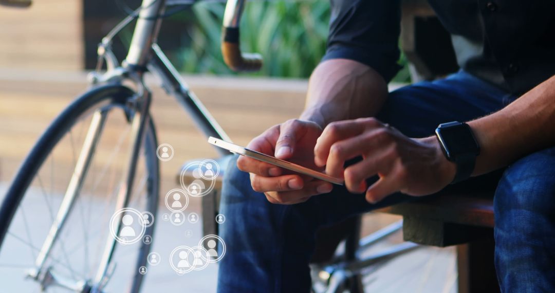 Individual holding smartphone, actively engaging with social media applications next to bicycle in urban environment. Illustrates the integration of modern technology in everyday life, emphasizing digital connectivity, mobility, and the dynamic nature of digital communication. Ideal for content related to outdoor activities, technology in daily motion, or lifestyle integration with smart devices.