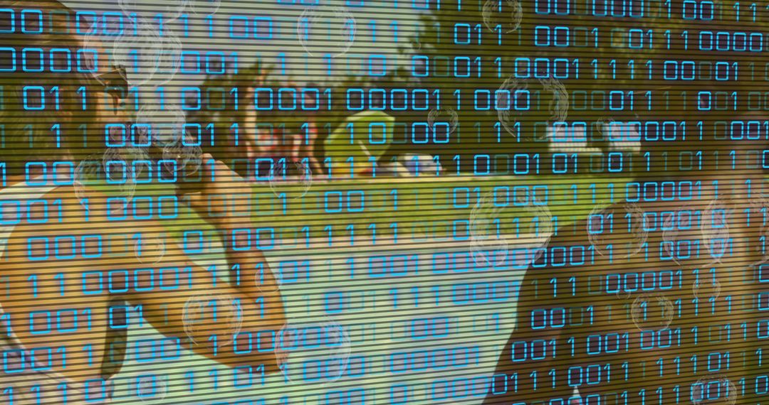 - Poolside friends chatting with binary code overlay representing digital privacy and tech