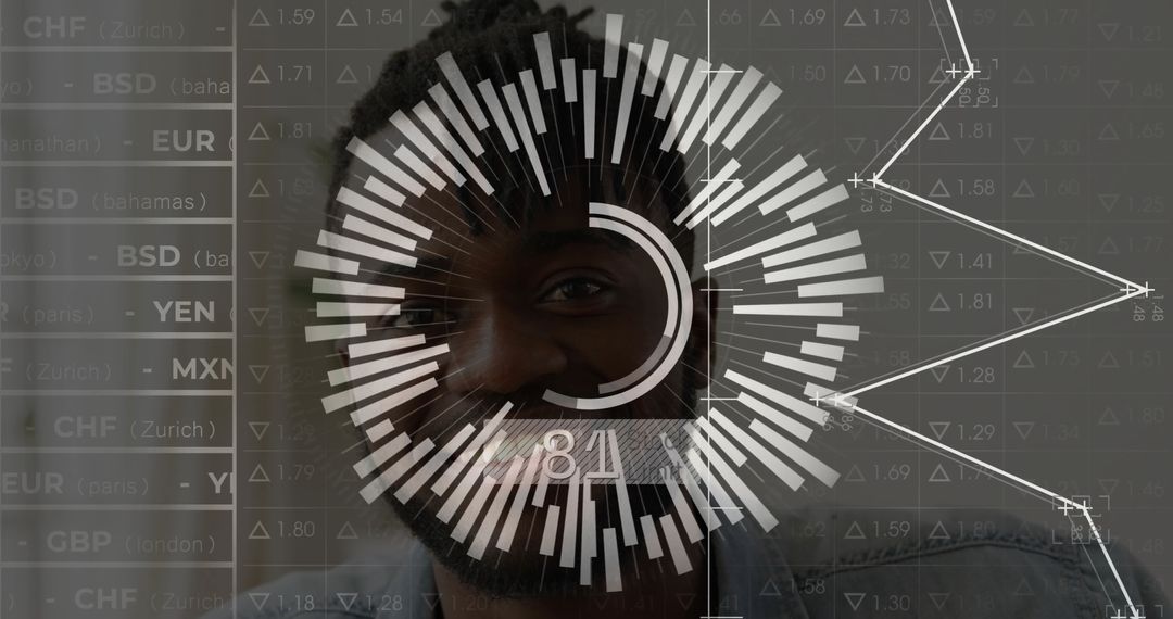 Visual depicting a person focusing on data analytics with a circular bar graph overlaid, integrating global currencies like EUR, JPY, DNS displayed within a contemporary office background. Ideal for themes concerning data-driven decision making, financial analysis, or technology illustration, providing a visual fit for educational content, finance sector marketing materials, or interactive designs blending human elements and sophisticated data visualization.