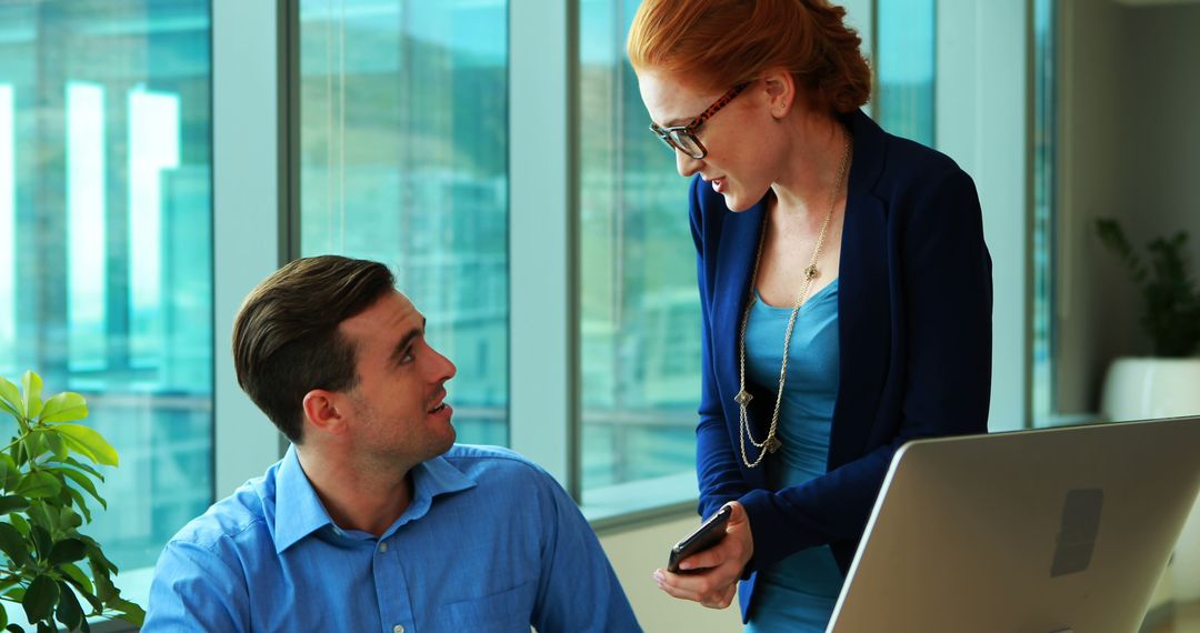 A man and woman engaging in a professional work conversation, promoting themes of collaboration and communication in a modern office. The workplaces can be used for articles on team dynamics, business environments, or interaction within corporate settings.