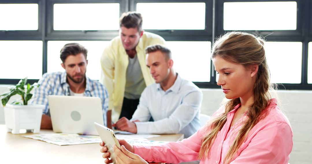 A young businesswoman focuses on her digital tablet while seated in a vibrant and modern office with her colleagues. Reinforce productivity and modern employment by depicting teamwork and technological integration. Ideally used for portraying contemporary workplace settings, teamwork or use of technology in professional environments.