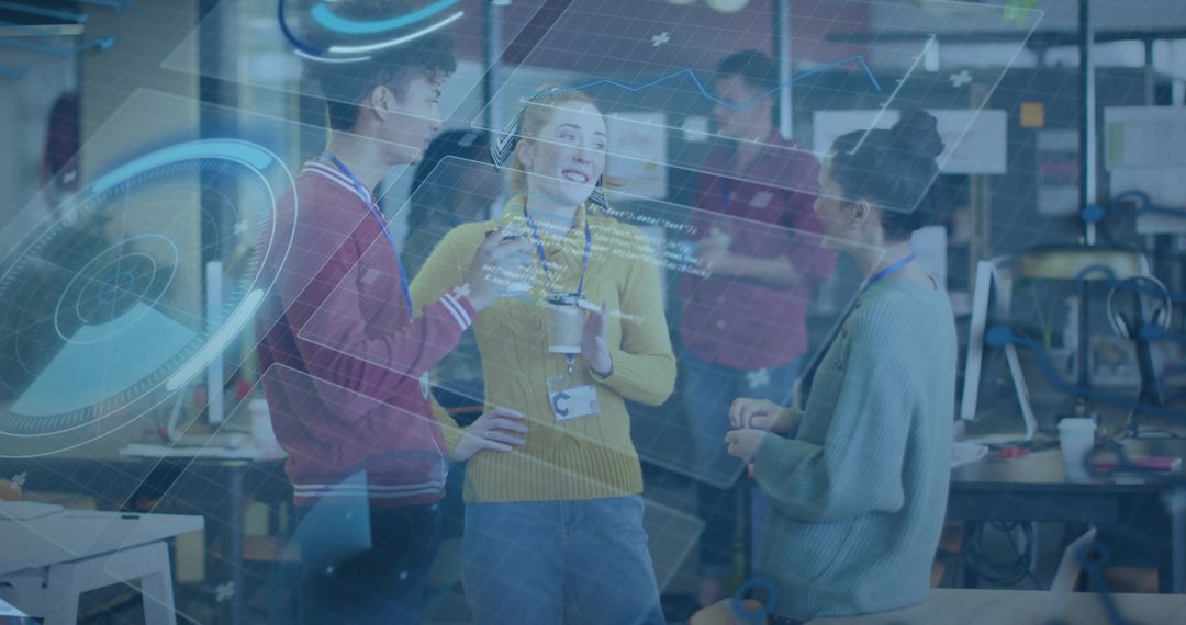 Three colleagues collaborating in open tech workspace, wearing conference lanyards and casual clothing, one holding coffee cup, holographic interface and data visualization overlaying scene to convey augmented reality and collaborative brainstorming. Showing friendly interaction, engaged discussion, and hands-on problem solving among young professionals in modern office. Featuring soft natural lighting, openplan layout, visible laptops and office equipment, subtle blue holographic overlay adding futuristic mood. Illustrating teamwork, innovation, and tech-driven creativity for marketing materials, website hero banners, blog posts about AR and UX, startup pitch decks, coworking space promotions, conference presentations, training modules, and social media campaigns. Offering ample negative space for text overlays and logos, suitable for horizontal and banner crops, editorial layouts, and slide backgrounds.