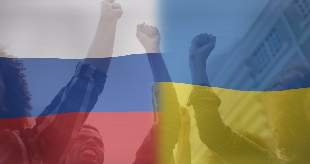 Group of diverse protesters appear beneath the translucent overlay of Ukraine and Russia flags, symbolizing international conflict and political tension. Their raised fists depict activism and the collective struggle for freedom and democracy. Suitable for articles on international relations, political blogs, and social campaigns illustrating global solidarity.