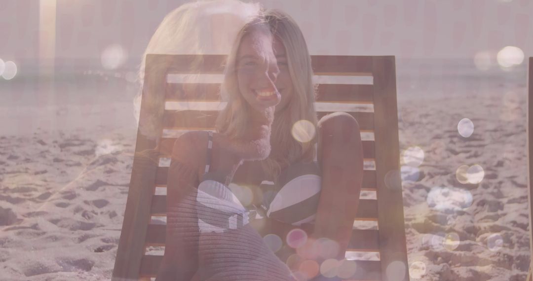 - Relaxed Woman at Beach with Sunlit Reflection Background
