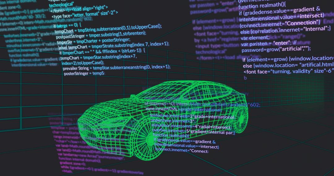 Rendering green wireframe car hovering over neon grid with floating code panels Image