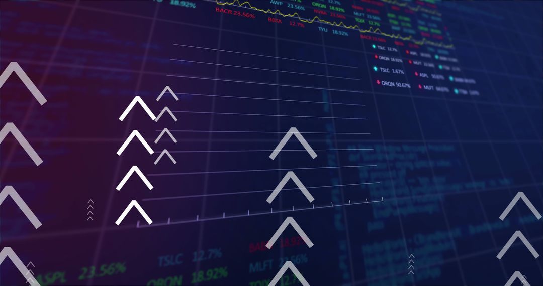 Depicting upward arrows over financial data graphs, symbolizing positive growth and trends in the financial sector. Useful for presentations on economic trends, stock exchange analysis, or as elements in financial reports and technology-related marketing materials.