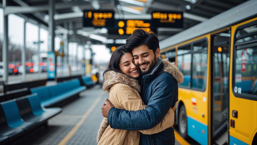 AI Generated Image. This scene captures a loving couple smiling and enjoying a warm embrace at a busy bus station, with a vibrant yellow and blue bus parked in the background. Their fur-lined coats indicate cozy warmth against a chilly cityscape. This visual is ideal for conveying themes of modern romance, urban lifestyle, companionship, winter travel, and public transportation. Perfect for use in promotional materials related to urban tourism, public transit, and seasonal activities.