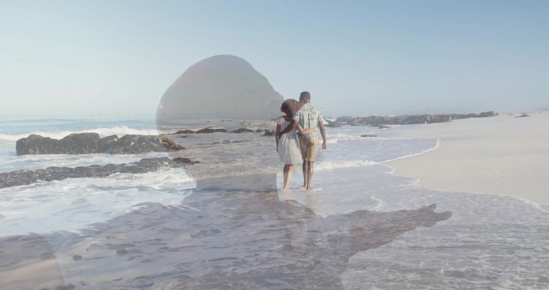 This image captures a romantic couple walking along a rocky shoreline, with ocean waves gently lapping alongside. The overlay of a silhouette suggests reflection and contemplation, adding depth to the scene. Perfect for use in projects focusing on love, companionship, and tranquility, especially those pertaining to romantic getaways, relationship counseling, and travel ads aimed at serene destinations.