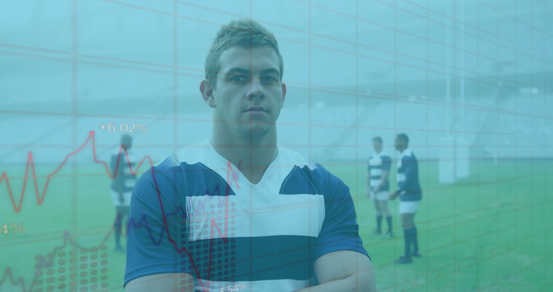 Rugby player depicted with a digital statistics graph overlay, visually demonstrating the integration of sports analytics and technology. Ideal for content related to data-driven strategies in sports, enhancing athletic performance through technical innovation, or representing teamwork with a high-tech context.